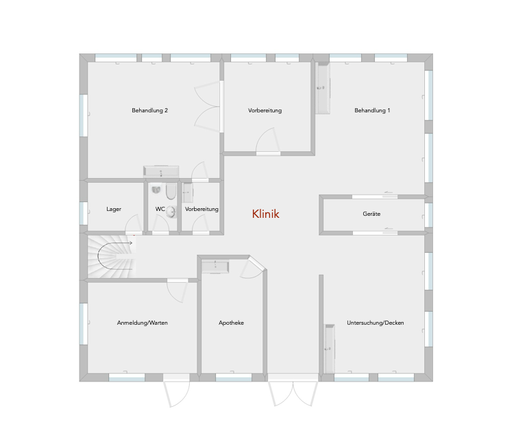 Das Gebäude besticht durch eine hochwertige Ausstattung, eine durchdachte Raumaufteilung mit mehreren Behandlungs- und Büroräumen und moderne technische Standards. Medizinische Geräte sind jedoch nicht vorhanden. Im Erdgeschoss befinden sich unter anderem der Empfangsbereich mit Wartezimmer, Behandlungs- und Untersuchungsräume, OP. inkl. Narkosebox, ein Röntgenbereich sowie die Apotheke. Das Obergeschoss bietet Büroräume, Besprechungsmöglichkeiten und Personalräume für Nachtwache, Küche und Sanitäranlagen.