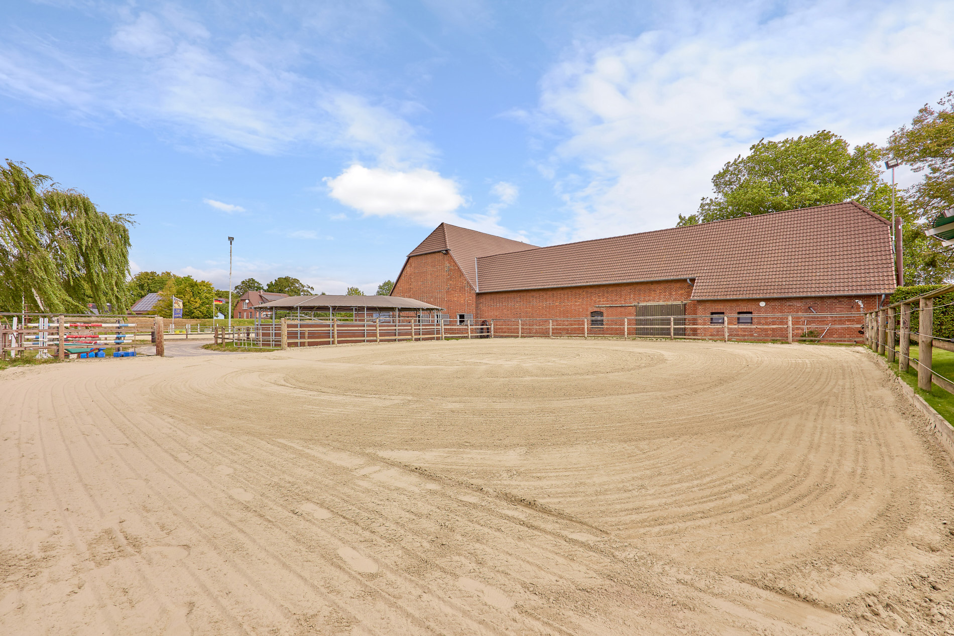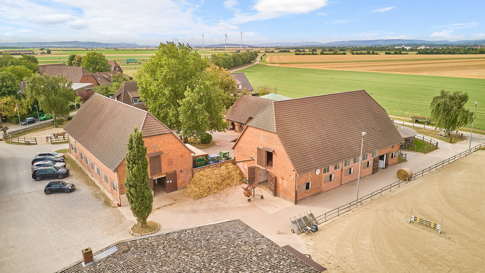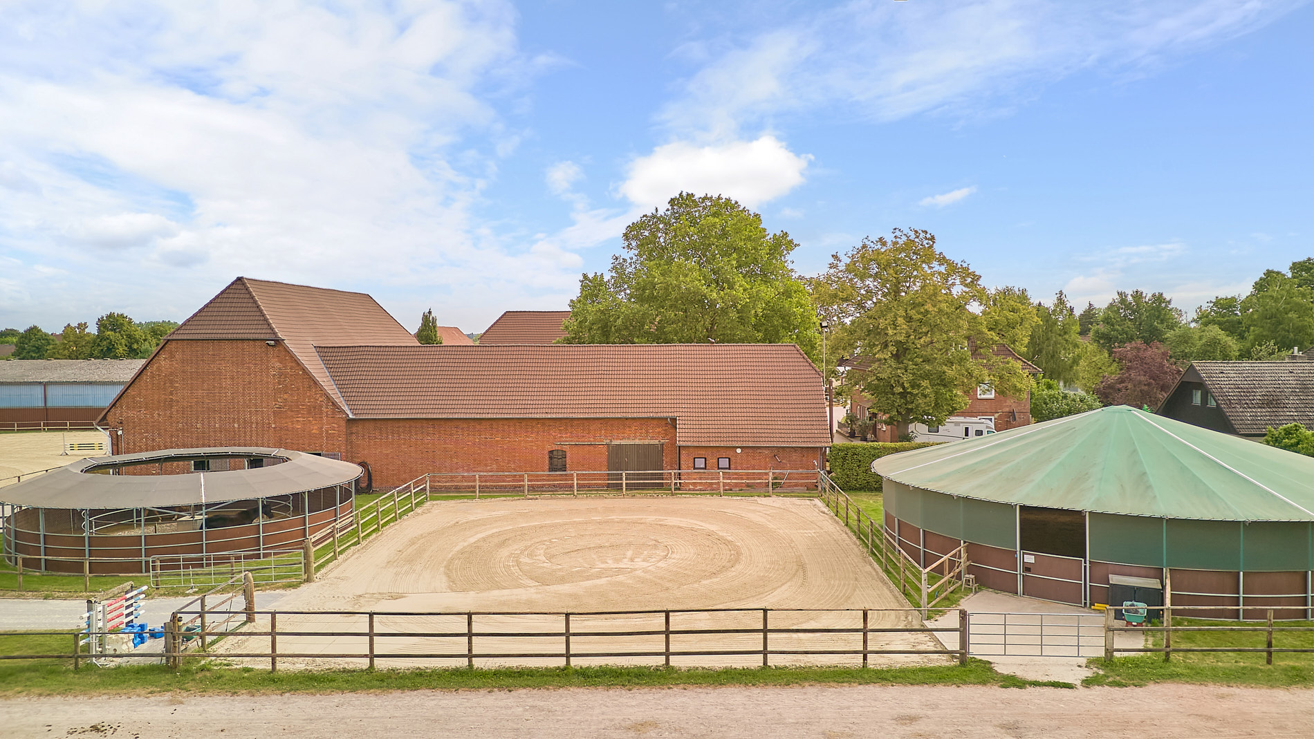 Diese Reitanlage bei Hannover – in Koldingen – vereint komfortables Wohnen mit professioneller Pferdehaltung. Der Haupthof ist in zwei groĂe StallgebĂ€ude, ein Wohnhaus und ein WirtschaftsgebĂ€ude unterteilt. ErgĂ€nzt durch umfassende Trainingsmöglichkeiten – dieser Pferdehof eignet sich daher wunderbar fĂŒr einen Pensionsbetrieb, Ausbildung & Verkauf von Pferden oder auch fĂŒr eine Reitschule.