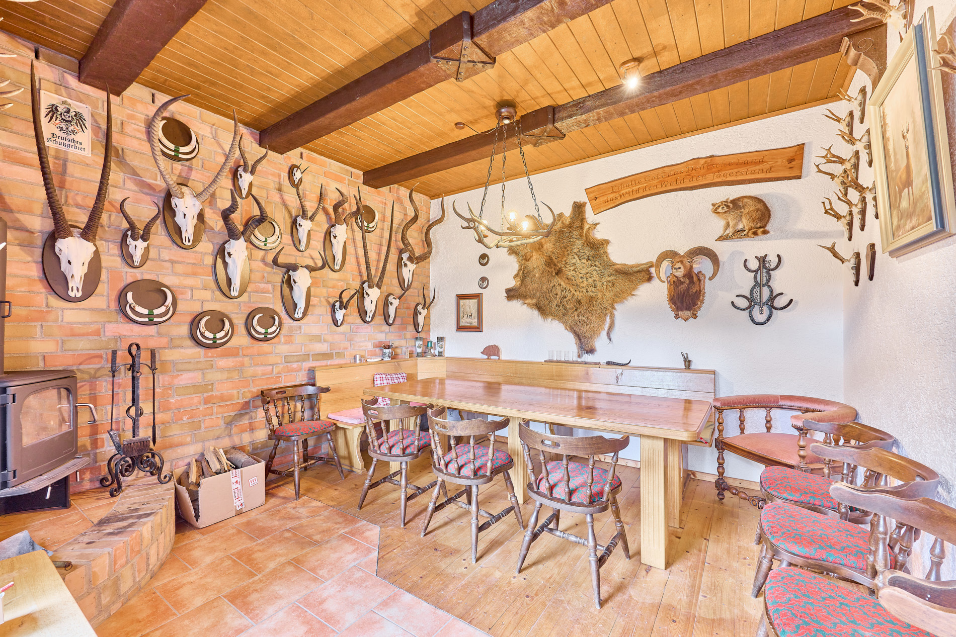 - Im EG befindet sich ein Jagdzimmer, eine KĂŒche, Werkstatt und Garagen fĂŒr KleingerĂ€te und PKW’s
