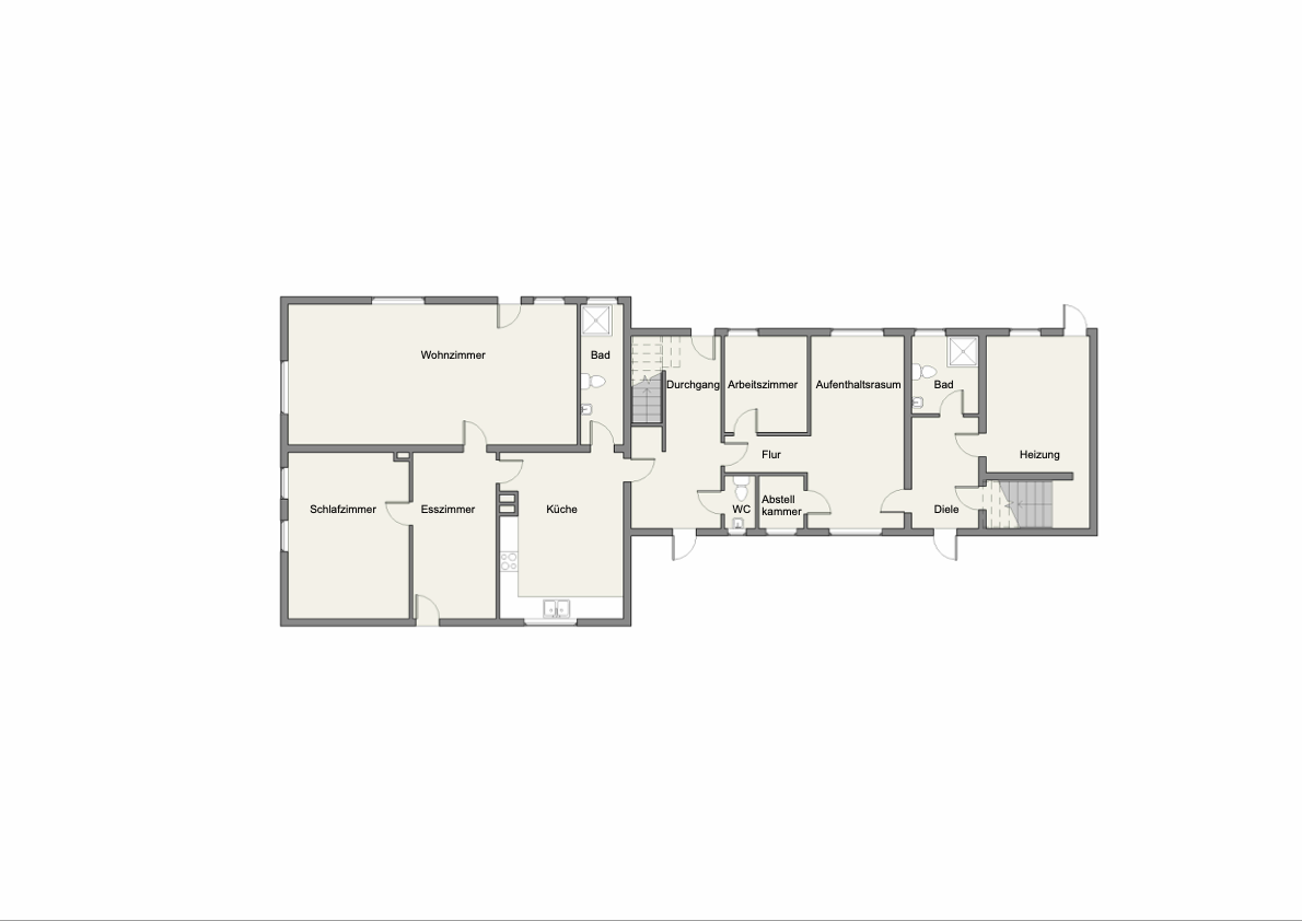 - Erdgeschoss: Hauptwohnung (Betreiberwohnung), 1 Schlafzimmer, 1 Wohnzimmer mit Essbereich, Küche und Badezimmer, Waschraum