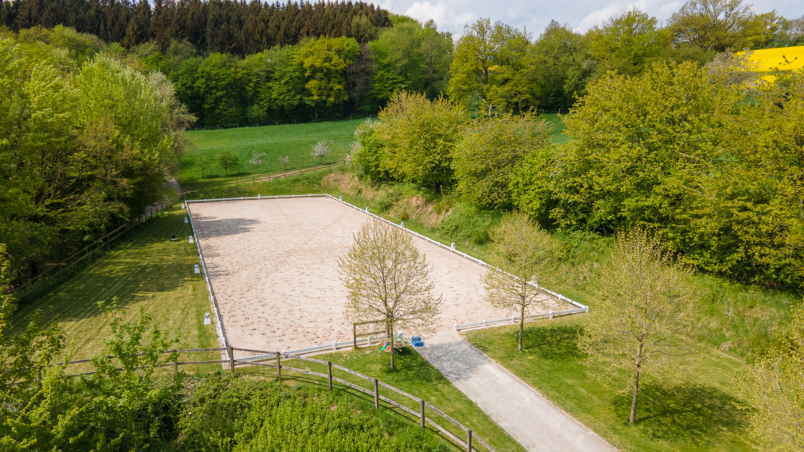 Für das tägliche Training bietet die Immobilie eine Führmaschine für 4 Pferde, eine Longierhalle (15 Meter Durchmesser), eine Reithalle aus 1993 mit den Maßen 19 x 42 Meter und einen traumhaften Dressurplatz aus 2012 mit einem Ebbe-Flut-System & den Maßen 20 x 60 Meter. Die im Eigentum befindlichen knapp 15 ha Weidefläche am Hof bieten beste Futtergrundlage, aber natürlich auch wunderbare Ausläufe für die Pferde. Auch hier befinden sich Selbsttränken, für entspanntere betriebliche Abläufe.