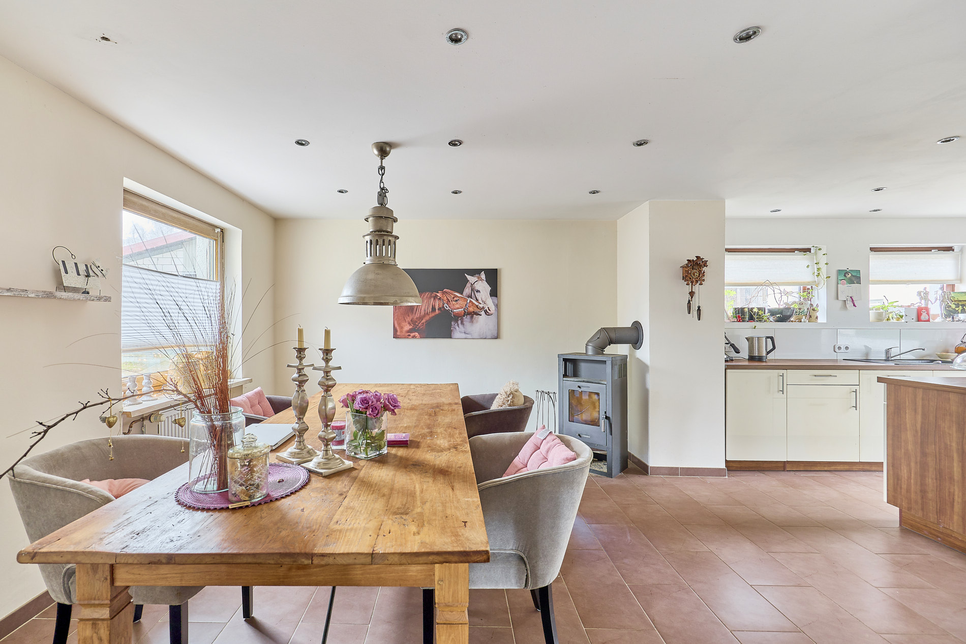 Das Wohnhaus aus dem Jahr 1970 umfasst rund 300 m² Wohnfläche, verteilt auf 3 Etagen plus Keller. In den Jahren 2010 – 2012 wurde nicht nur der Betrieb von einem ehemaligen Milchviehbetrieb zur Pferdepension, sondern auch das Wohnhaus bekam einen neuen Charakter. Heute finden Sie moderne und helle Wohnräume wieder, einen einladenden Wintergarten und freie Sicht über die Reitanlage. Das Haus wird über eine Flüssiggas-Heizung aus 2010 beheizt, verfügt über Öfen und Doppelverglasung aus 1996.