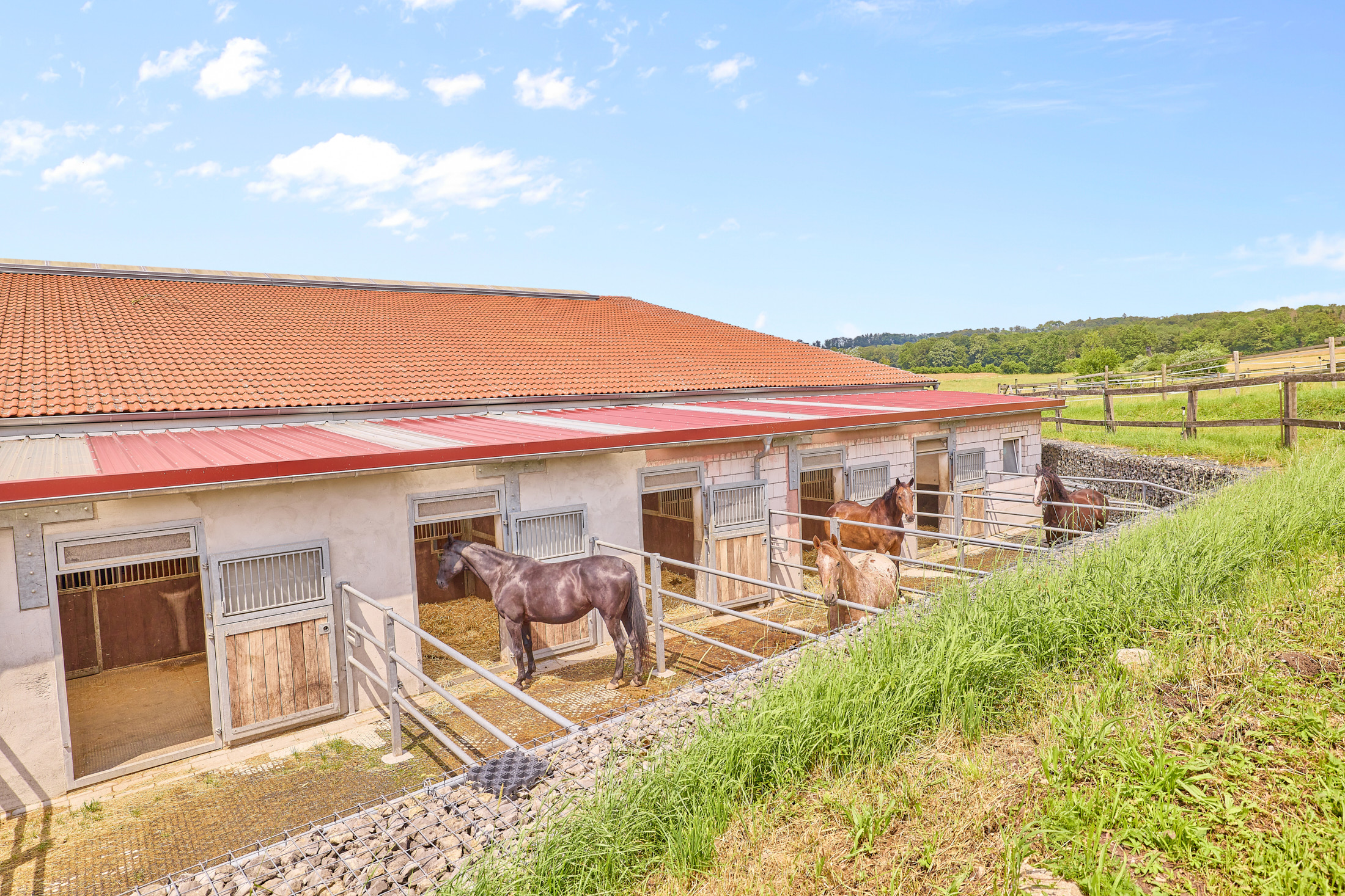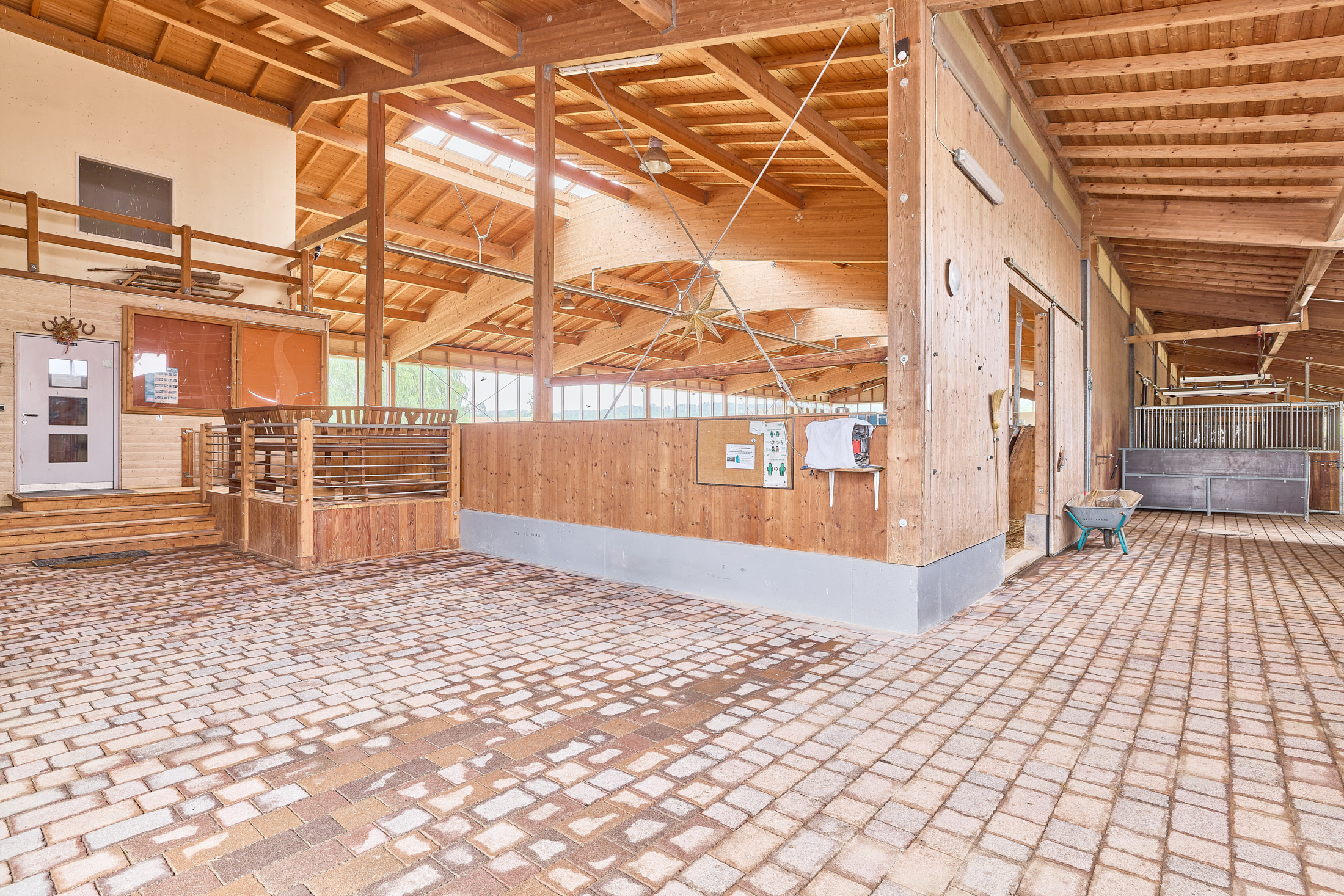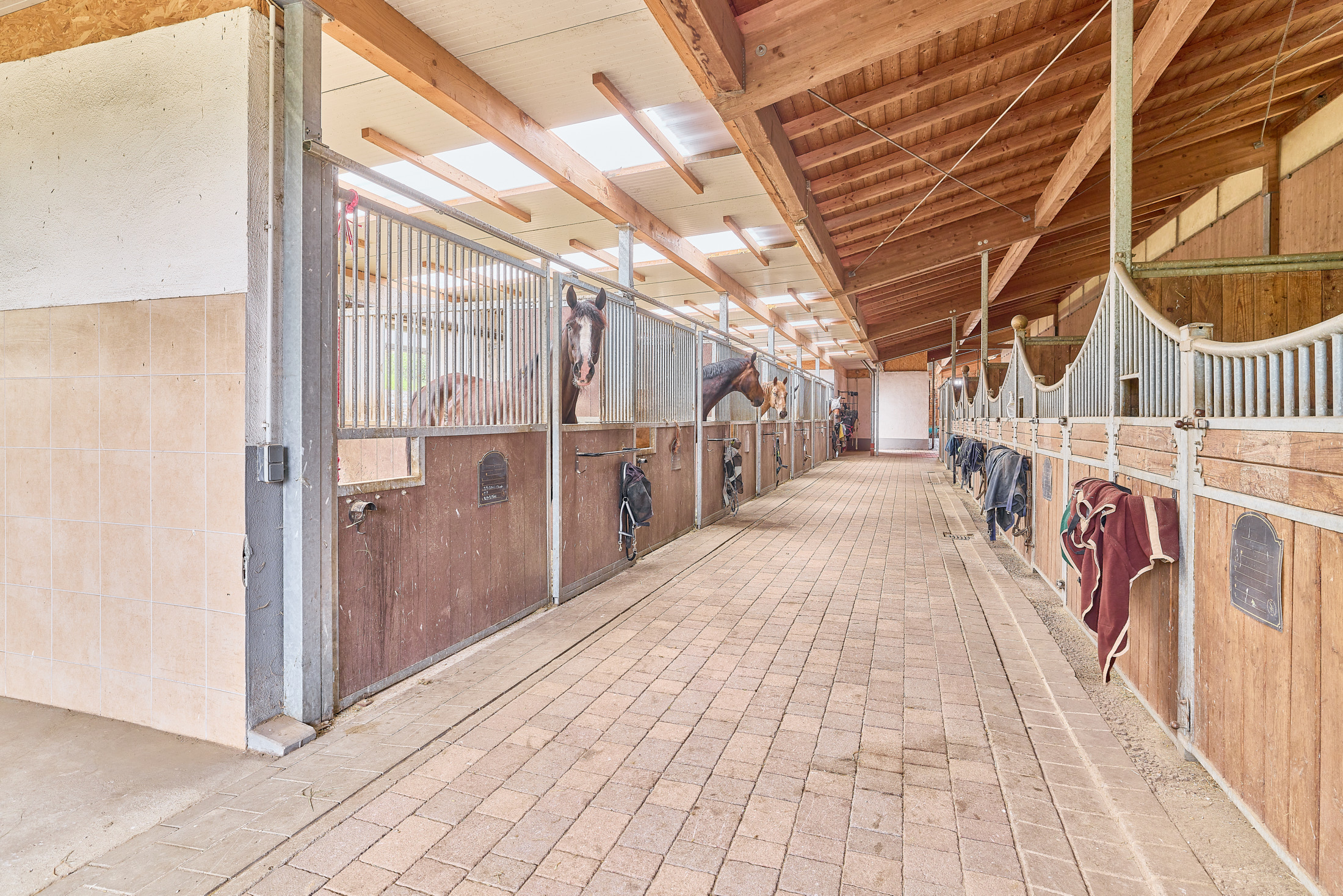 Die Reitanlage bietet Platz für etwa 21 Pferde, verteilt auf zwei Stalltrakte. Der private Bereich mit sieben Boxen und eigener Sattelkammer kann perfekt vom Betriebsbereich mit weiteren vierzehn Boxen getrennt werden. Ein Großteil der Anlage besteht aus großzügigen Paddockboxen, die artgerechte Haltung und Komfort vereinen. Insgesamt umfasst die Hoffläche eine Fläche von 9.796 m²; weitere Flächen sind langfristig angepachtet.