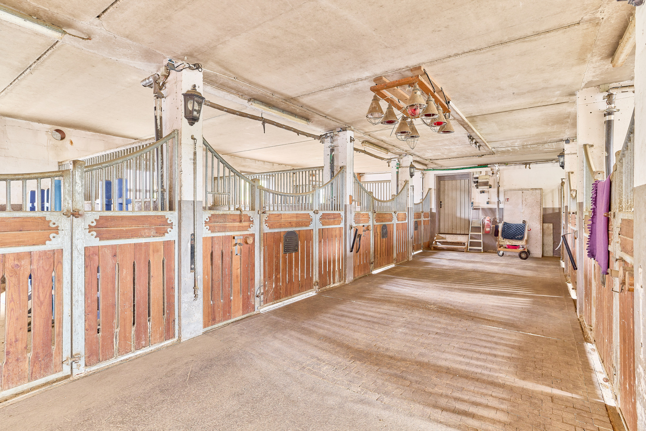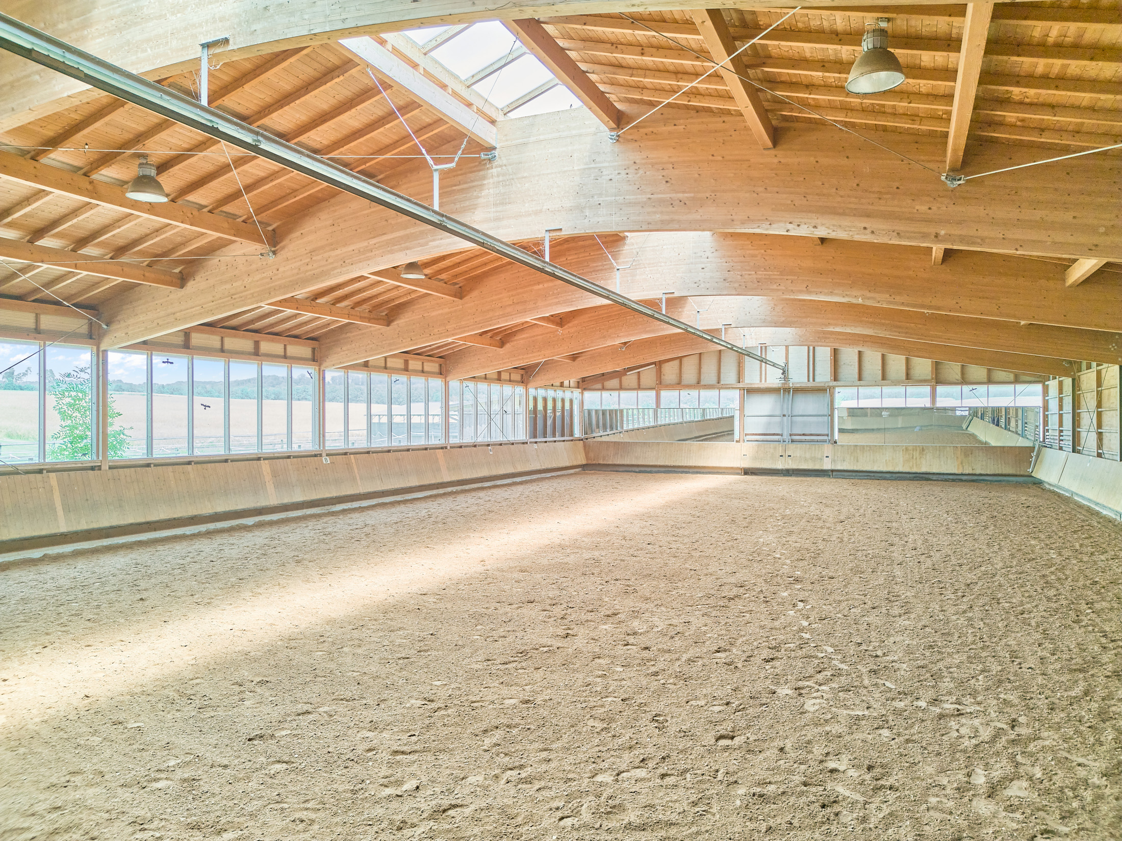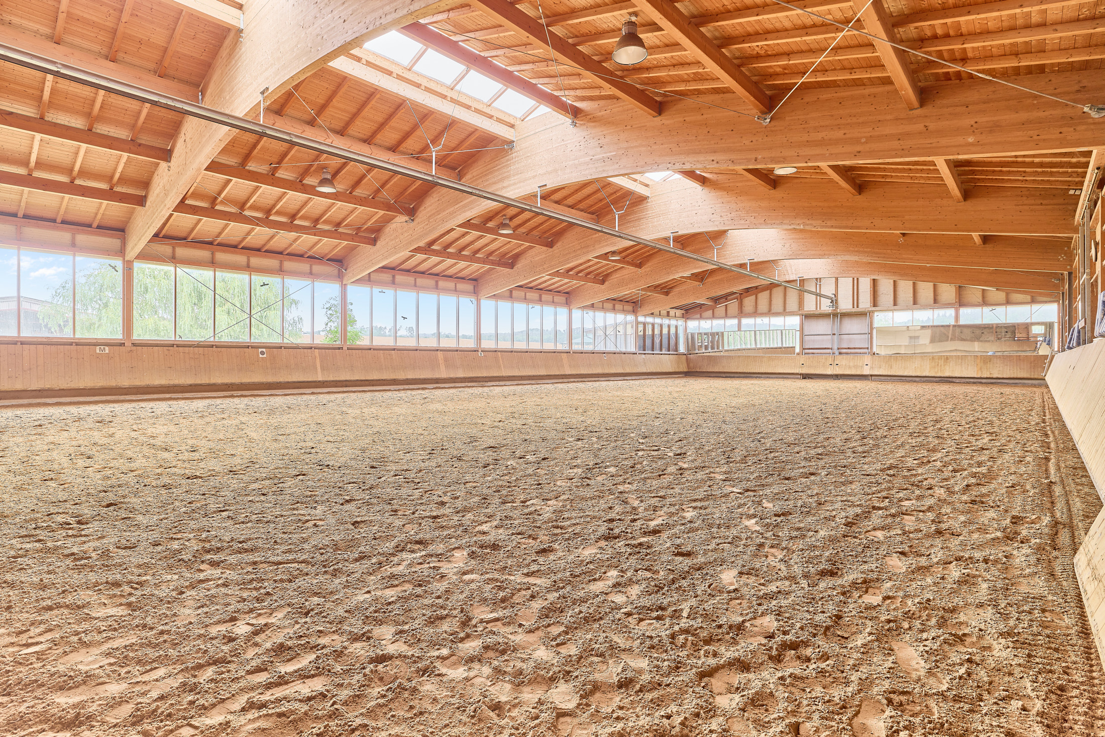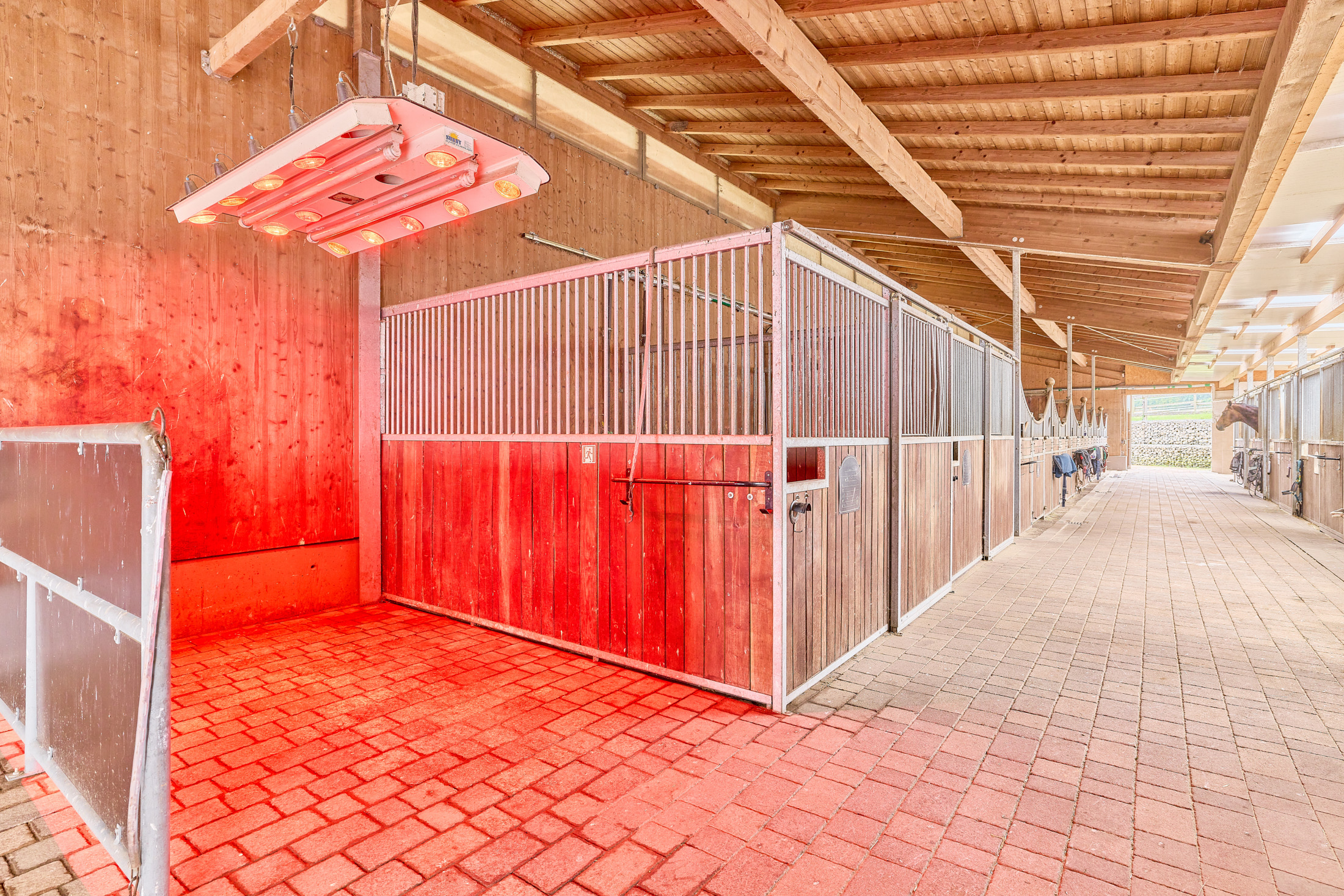Die Reitanlage bietet Platz für etwa 21 Pferde, verteilt auf zwei Stalltrakte. Der private Bereich mit sieben Boxen und eigener Sattelkammer kann perfekt vom Betriebsbereich mit weiteren vierzehn Boxen getrennt werden. Ein Großteil der Anlage besteht aus großzügigen Paddockboxen, die artgerechte Haltung und Komfort vereinen. Insgesamt umfasst die Hoffläche eine Fläche von 9.796 m²; weitere Flächen sind langfristig angepachtet.
