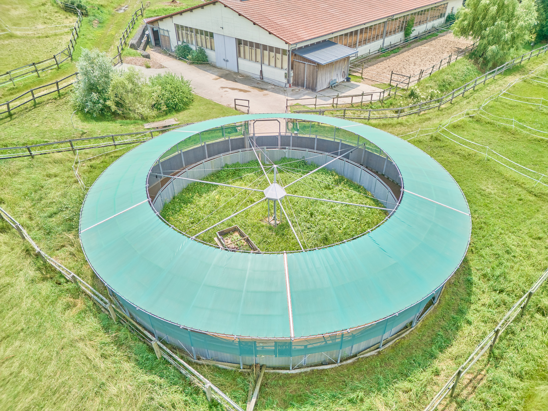 Die Anlage verfügt über eine großzügige Reithalle mit dem Maß 20 × 40 Meter, ausgestattet mit einer modernen Beregnungsanlage, integrierten Lagerflächen, Sitzgelegenheiten und sogar einer Mitarbeiterwohnung. Ergänzt wird das Trainingsangebot durch eine überdachte, matschfrei befestigte Führanlage für sechs Pferde – ideal für ein durchdachtes und schonendes Bewegungsmanagement.