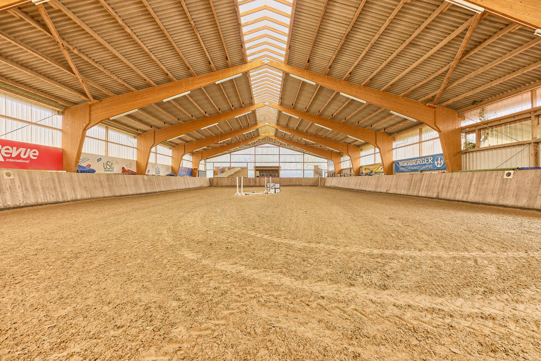 Die Reithalle aus dem Jahr 2004 bietet mit 20 Ă 40 Metern ReitflĂ€che und einem Sand-/Textilboden optimale Trainingsbedingungen. Die Leimbinderkonstruktion, groĂzĂŒgige LichtbĂ€nder und ein angrenzendes ReiterstĂŒbchen sorgen fĂŒr eine helle, funktionale und angenehme ReitatmosphĂ€re. ErgĂ€nzend steht ein groĂer, drainierter Gras-Reitplatz, ein Longierzirkel (Ă 18 m) und eine FĂŒhrmaschine fĂŒr vier Pferde zur VerfĂŒgung.