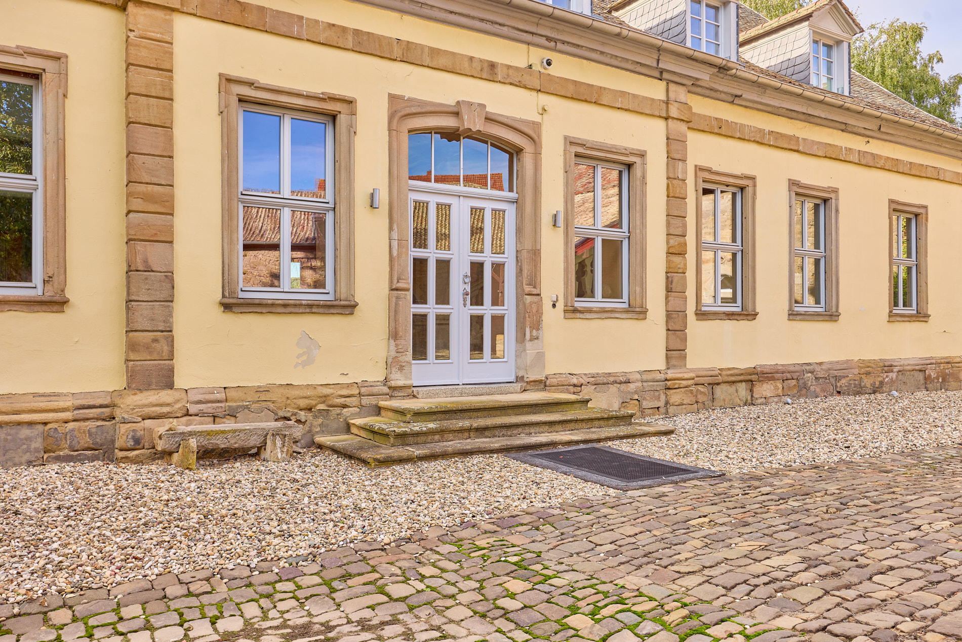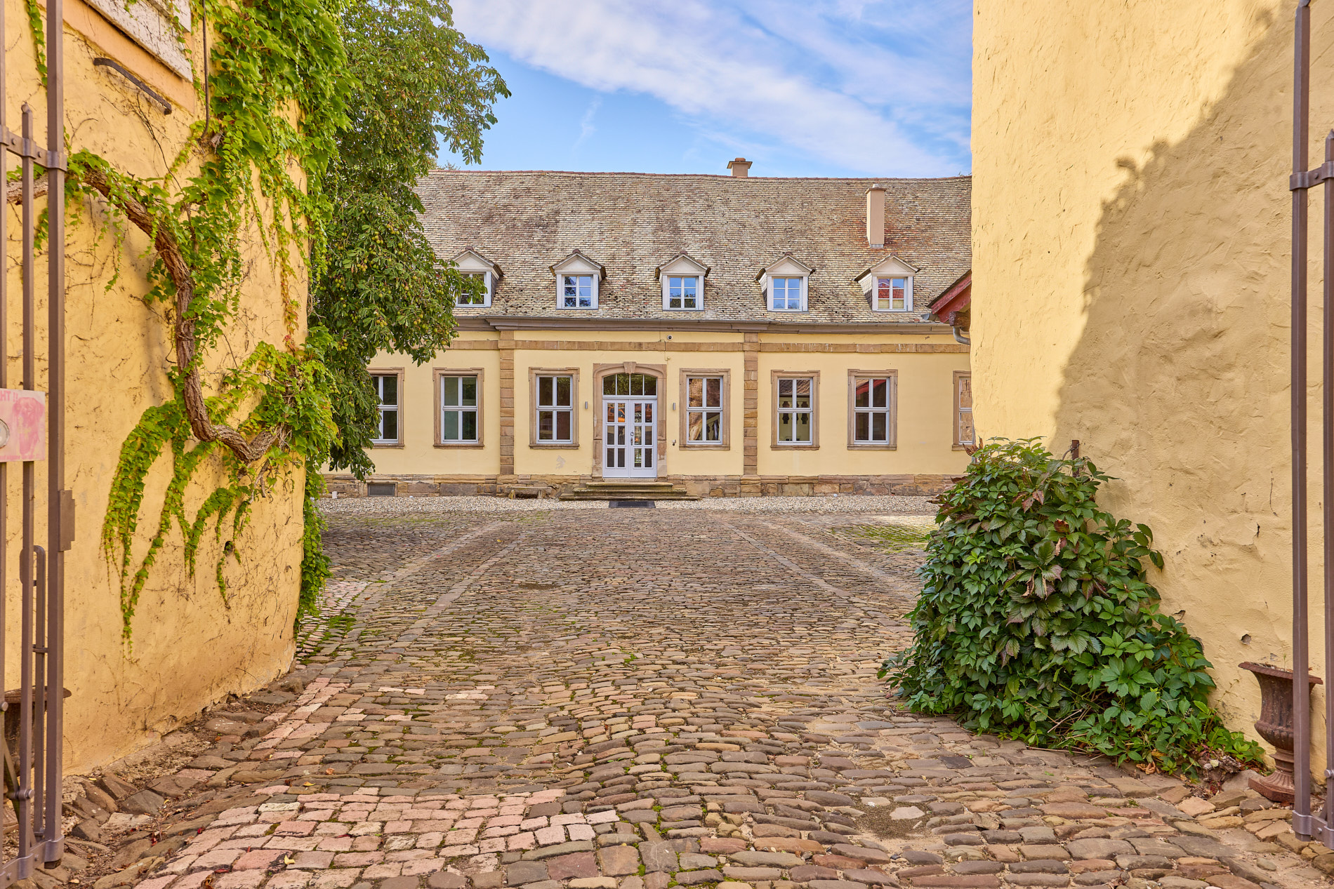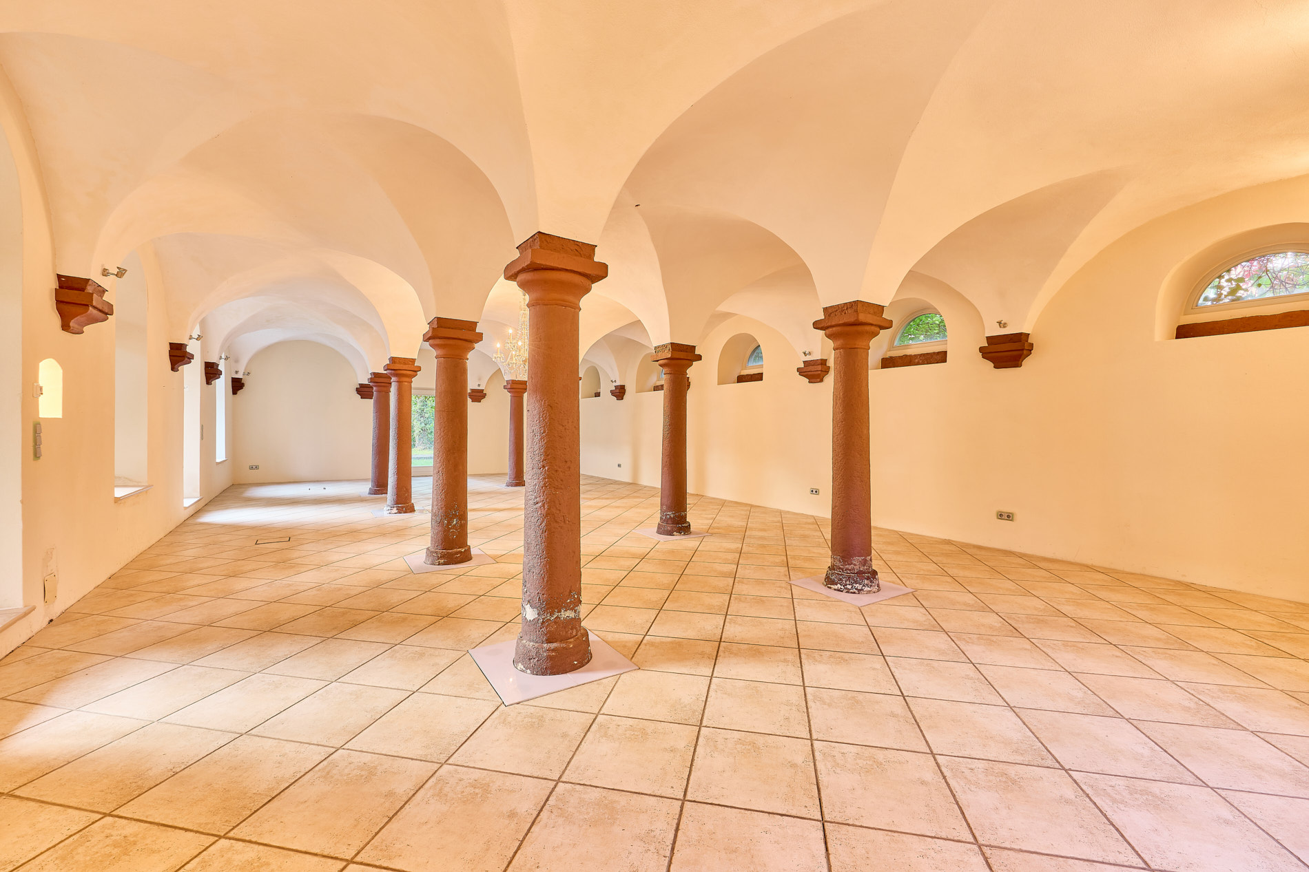 Der im Innenhof gelegene Festsaal mit rund 115 m² Fläche, Fußbodenheizung und indirekter Beleuchtung eignet sich ideal für Hochzeiten oder besondere Events und verfügt über eine Ausbaureserve im Dach. Ergänzt wird das Anwesen durch ein Gästehaus mit sechs hochwertig eingerichteten Apartments auf ca. 200 m² Wohnfläche, jeweils mit eigener Küche und Bad, zwei davon mit Terrassen und Blick auf den Schlossgarten.
