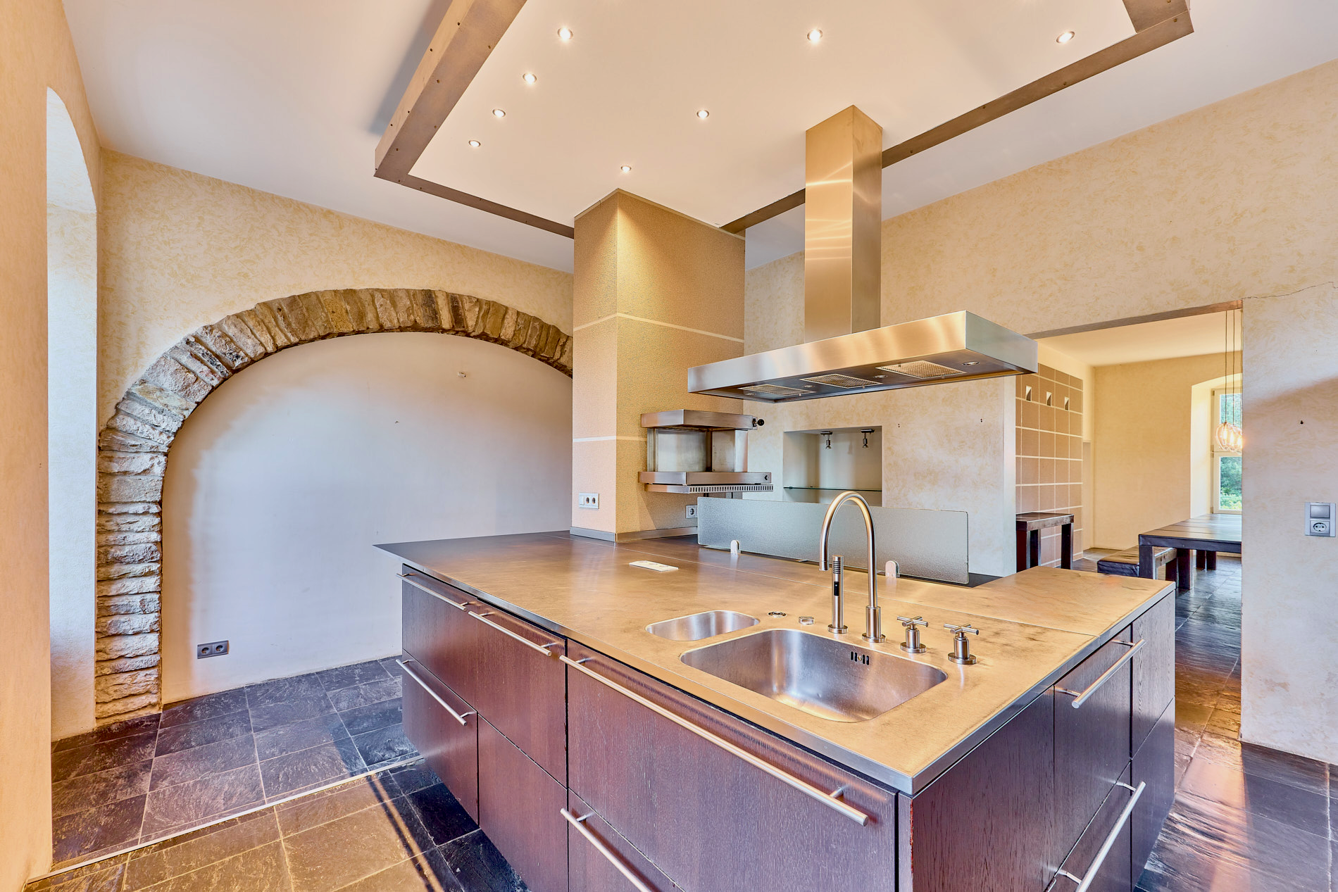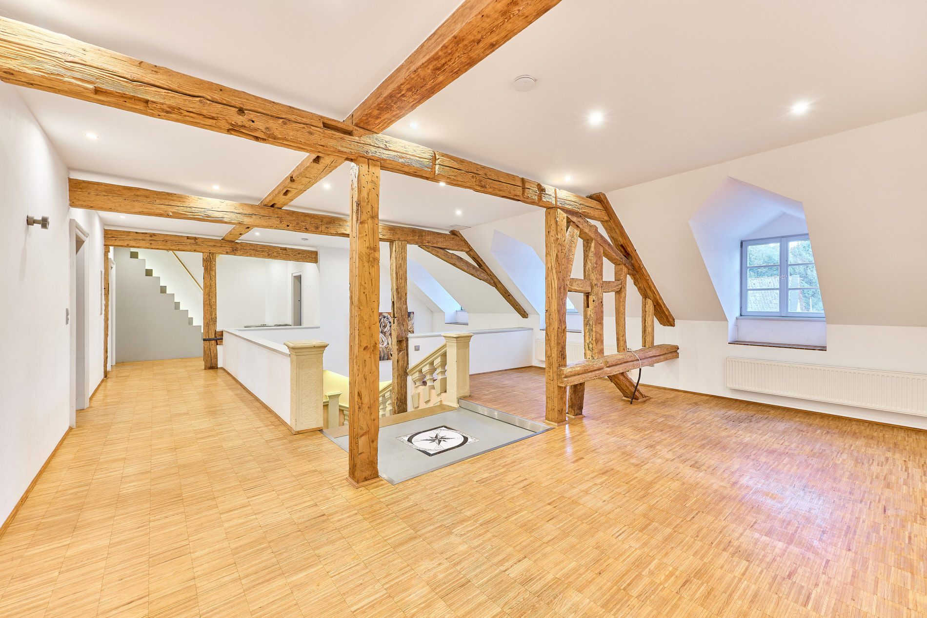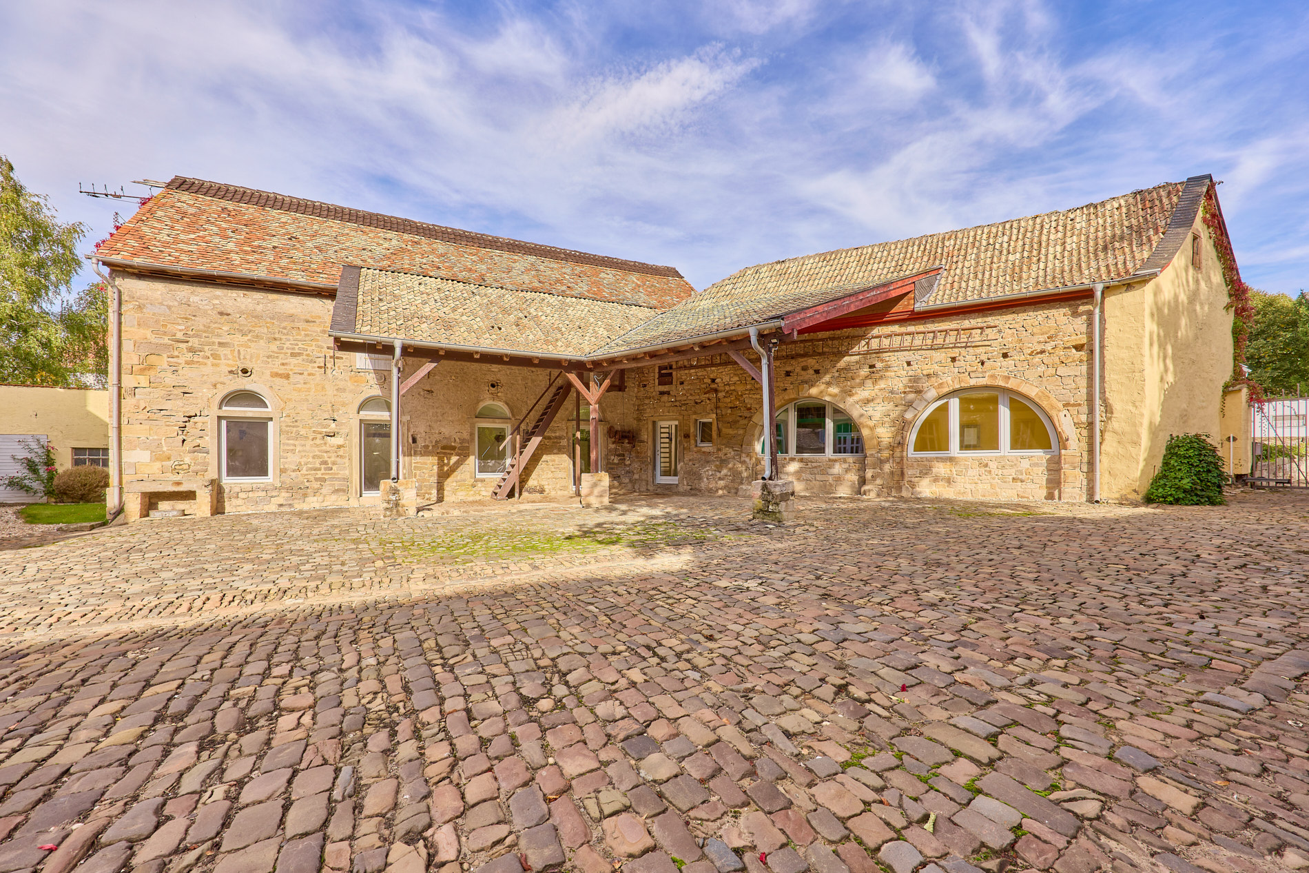 Der im Innenhof gelegene Festsaal mit rund 115 m² Fläche, Fußbodenheizung und indirekter Beleuchtung eignet sich ideal für Hochzeiten oder besondere Events und verfügt über eine Ausbaureserve im Dach. Ergänzt wird das Anwesen durch ein Gästehaus mit sechs hochwertig eingerichteten Apartments auf ca. 200 m² Wohnfläche, jeweils mit eigener Küche und Bad, zwei davon mit Terrassen und Blick auf den Schlossgarten.