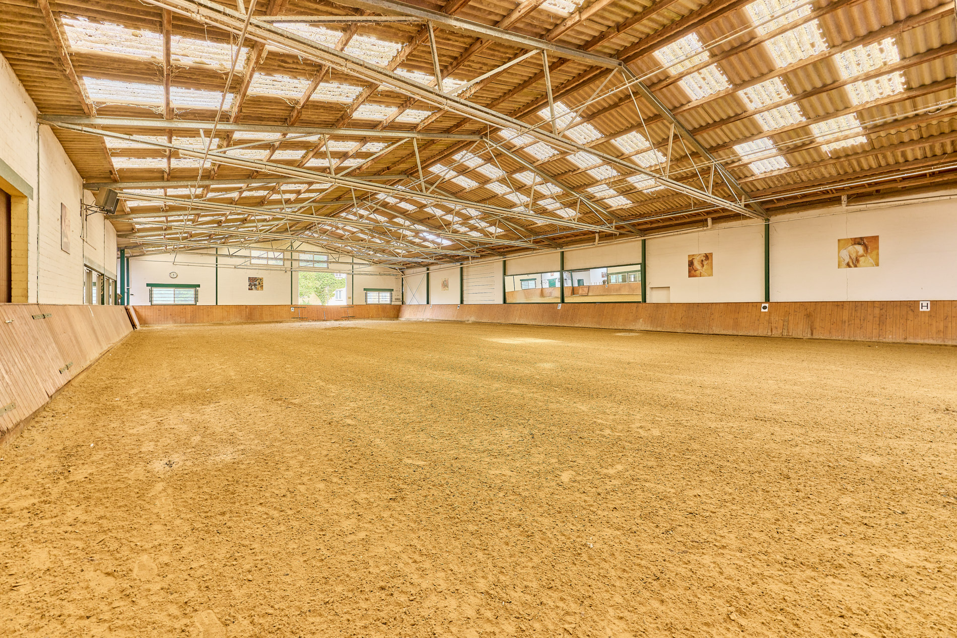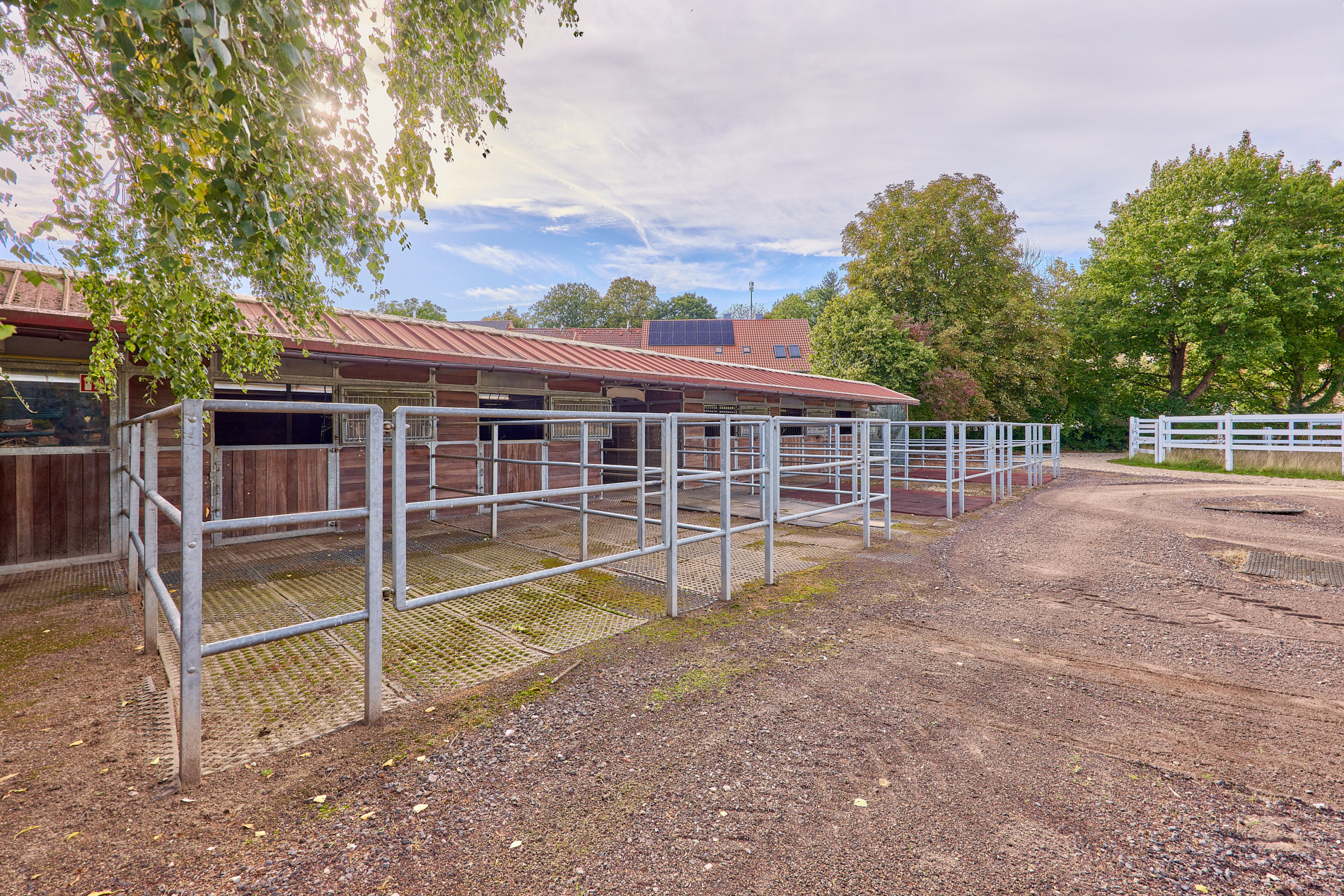 Die Reitanlage umfasst eine 20 x 40 m große Reithalle, einen 20 x 60 m großen Dressurplatz, Paddock- und Innenboxen, Sattelkammern, Reiterstübchen und Winterpaddocks sowie eine denkmalgeschützte freitragende Scheune mit rund 720 m² Grundfläche.