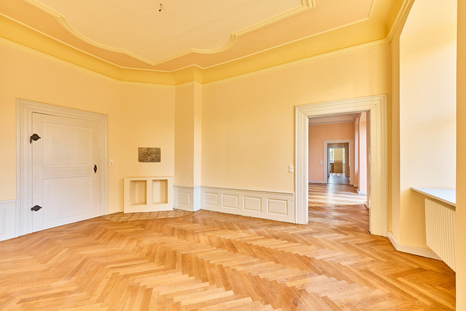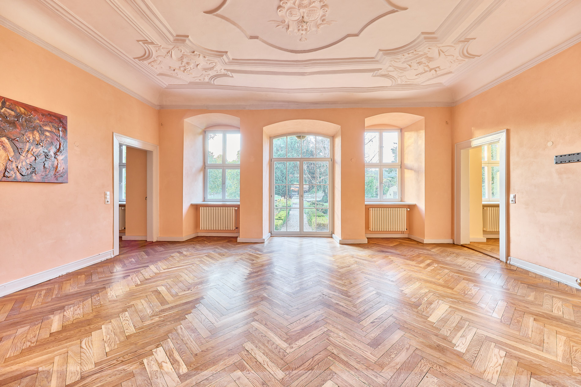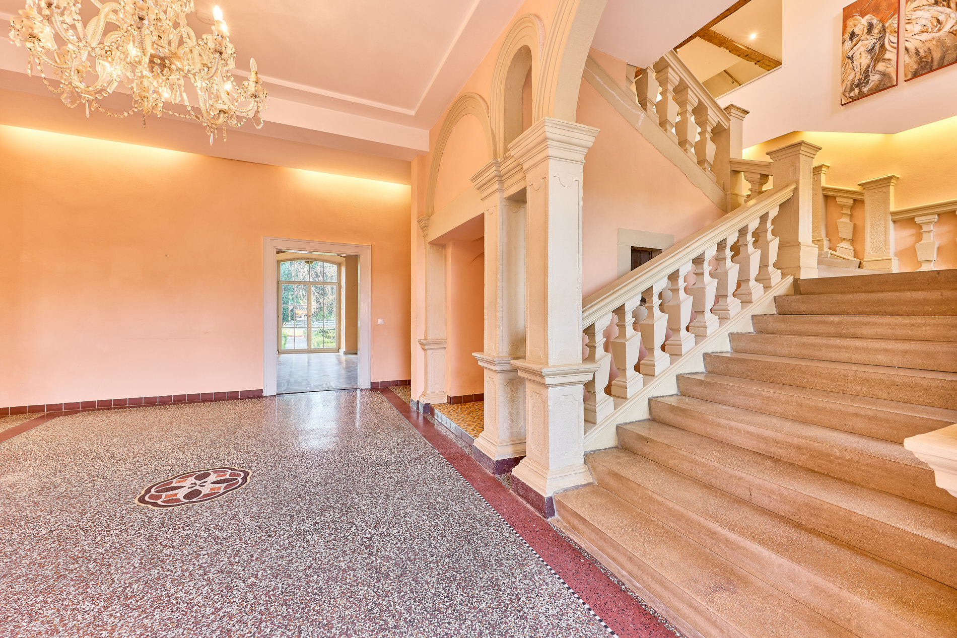 - Terazzomosaik im Flur, Steintreppe mit Balustern, aufwendige Stuckdecken mit allegorischen Darstellungen der vier Jahreszeiten