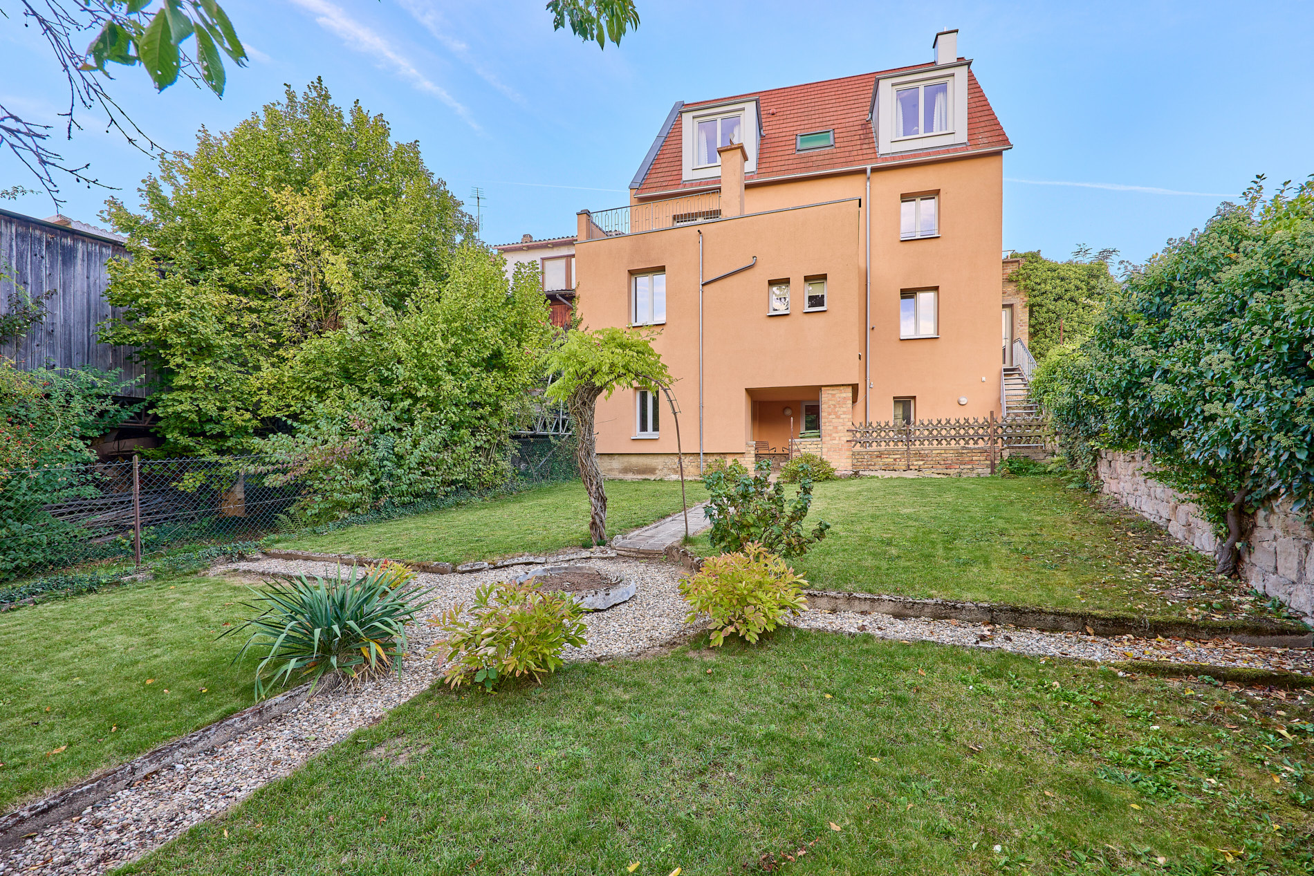 Hochwertige Materialien, Stuckdecken, ein Terrazzomosaikboden im Flur, Granit und Echtholzparkett prägen das Interieur. Die Küche der Marke Poggenpohl ist mit professionellem Gaggenau-Equipment ausgestattet, während das Master-Badezimmer Designer-Elemente von Philippe Starck, freistehende Badewanne und Fußbodenheizung bietet. Ein Kamin im Wohnbereich, eine Öl-Zentralheizung, Videoüberwachung und großzügige Parkanlagen mit romantischen Sitzecken runden das exklusive Wohngefühl ab.