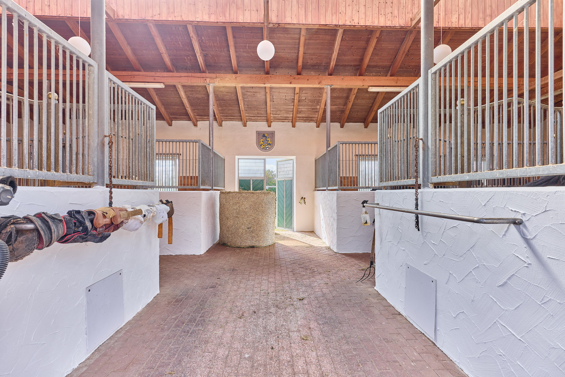 Die gepflegte Reitanlage umfasst eine Stallgasse (2002) mit 7 Boxen, beheiztem Tränkensystem, Sattel- und Futterkammer, Waschplatz sowie angrenzenden Maschinenunterstand und Lagerflächen. Eine Reithalle (40 x 25 m, Baujahr 2004) mit Beregnungsanlage, ein Offenstall für 4 Pferde, eine Führmaschine und großzügige Koppelflächen direkt am Hof runden das Pferdeangebot ab.