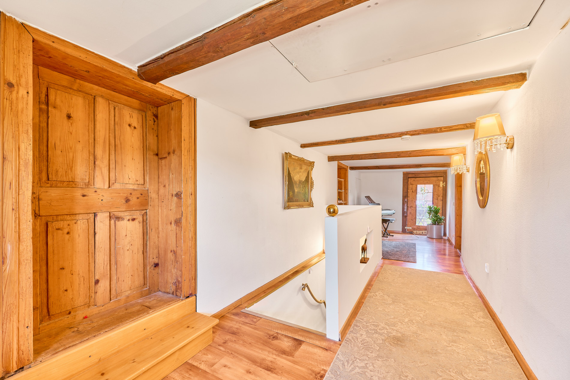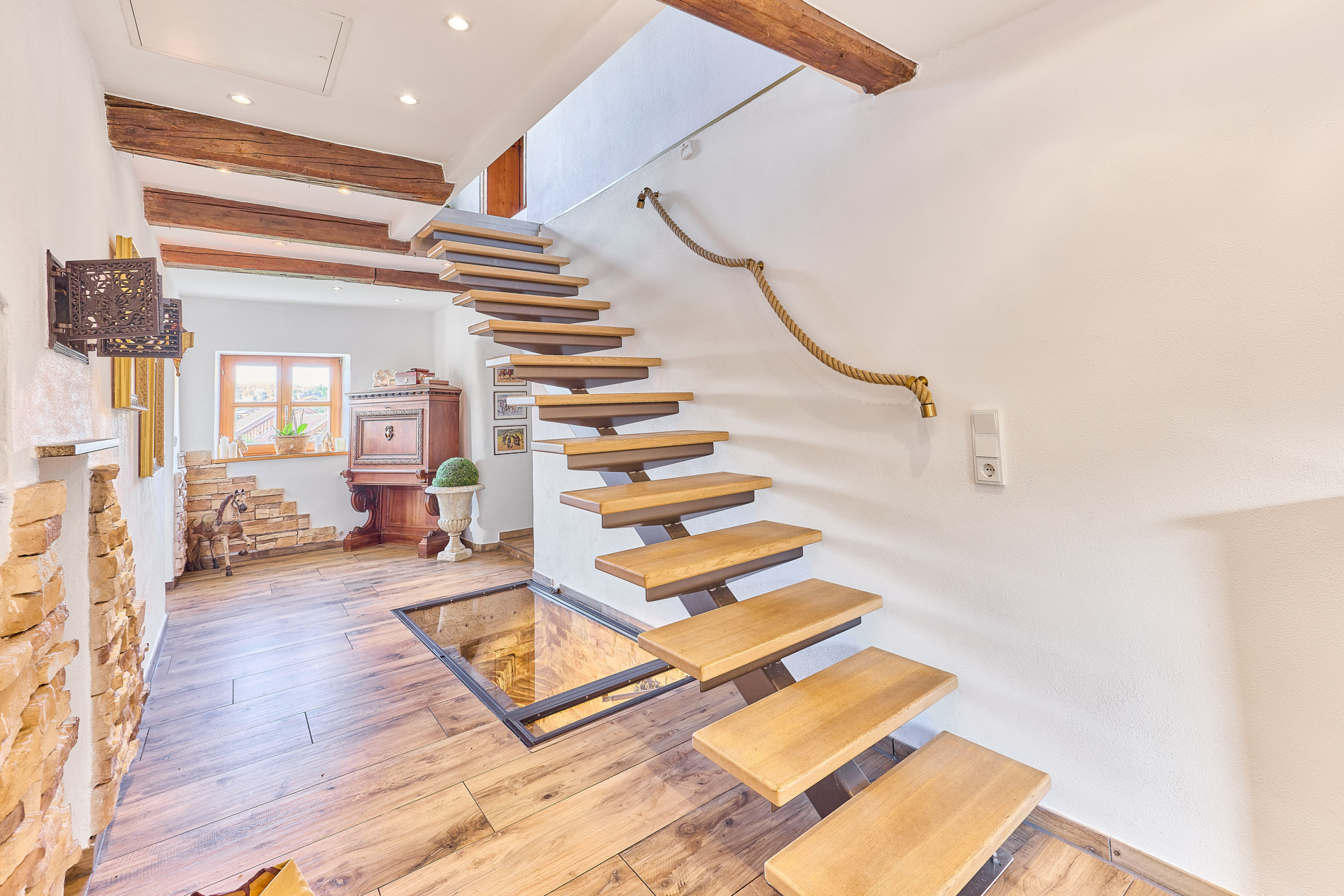 Linksseitig des Hauses befindet sich im Erdgeschoss der Hauptwohnbereich mit Küche, Esszimmer, Badezimmer und Kellerzugang. Zur rechten Seite finden Sie ein ehemaliges Reiterstübchen, die Sattel- und Futterkammer und ein Hof-WC- Auch der Technik- und Heizungsraum befindet sich im Erdgeschoss.